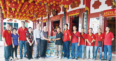 (古晋15日讯)古晋东岳观为50户贫穷人士献上爱心关怀,赠送米粮、食油及年柑给他们,让他们也欢喜迎接华人农历新年喜庆。古晋东岳观主席天猛公刘金荣表示,布施活动是该观的长年活动之一,同时在布施活动上,也派发一个红包给受惠者。