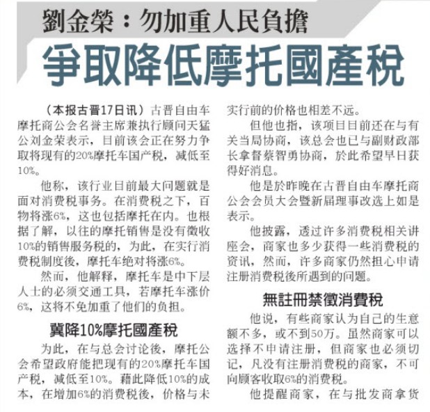 为此,在与总会讨论后,摩托公会希望政府能把现有的20%摩托车国产税,减低至10%。借此降低10%的成本,在增加6%的消费税后,价格与未实行前的价格也相差不远。