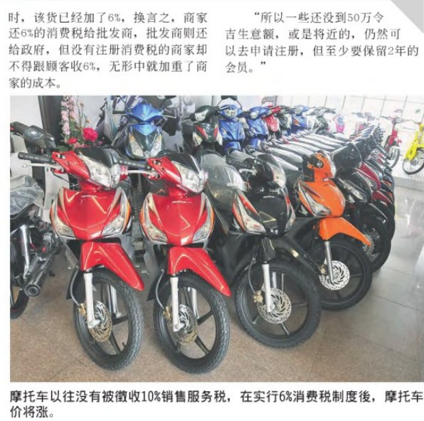 他提醒商家,在与批发商拿货时,该货已经加了6%,换言之,商家还6%的消费税给批发商,批发商则还给政府,但没有注册消费税的商家却不得跟顾客收6%,无形中就加重了商家的成本。