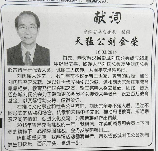 恭贺晋汉省彭刘公会成立25周年纪念之喜