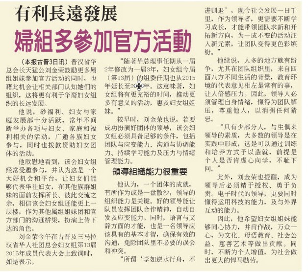 董事主席天猛公刘金荣受邀华人社团总会妇女组第13届2015年成员代表大会开幕