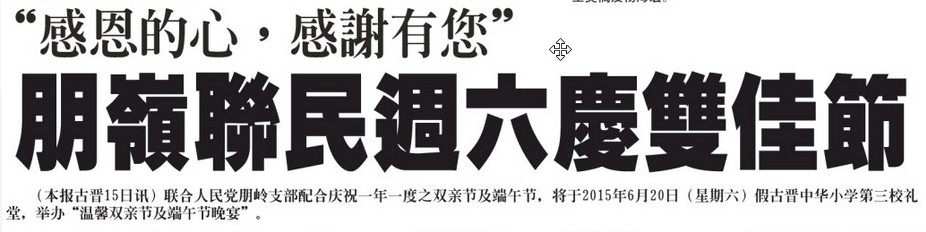 (本报古晋15日讯)联合人民党朋岭支部配合庆祝一年一度之双亲节及端午节,将于2015年6月20日(星期六)假古晋中华小学第三校礼堂,举办“温馨双亲节及端午节晚宴”。