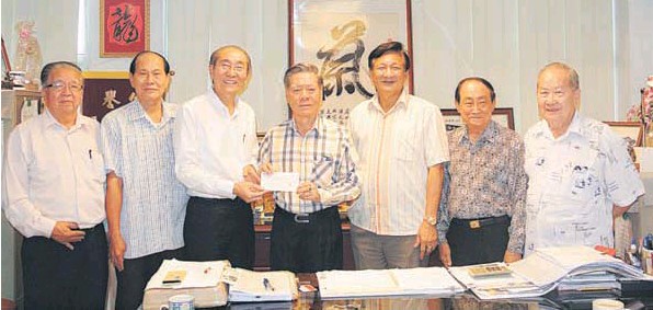 晉漢連省華人社團總會永久名譽會長兼執行顧問蔡子今(右4)移交款項給會長天猛公劉金榮。左起為副會長翁岳春、副會長陳國就、署理會長王長福、監察主席拿督沈瑞永以及副主席鍾名寶。