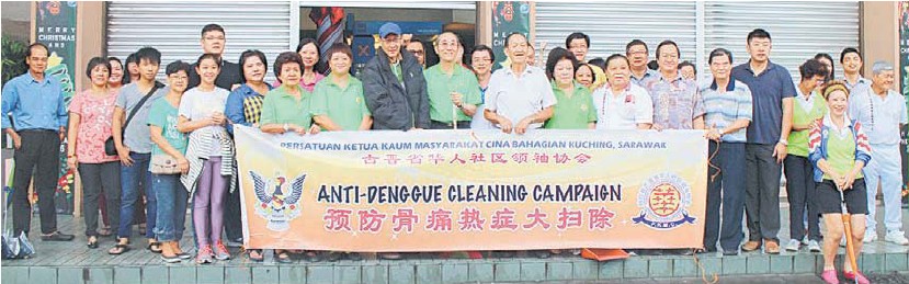 (本報古晉19日訊)古晉省華人社區領袖今早在縣公署的領導下,往露天巴剎進行大掃除及清洁運動,倡導及提高公眾對于消滅黑斑蚊及防范骨痛熱症的意識及措施,有效的控制骨痛熱症的病原及黑斑蚊的滋生。