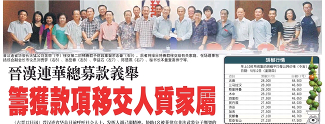 (古晉12日訊)晉漢連省華總日前呼吁社會人士,發揮人溺己溺精神,協助4名被菲律賓非法武裝分子綁架的詩巫華裔青年,獲得社會善心人士和該會理事与會員的積极響應,第一階梯的善款已由該會財政拿督余志豪轉交給有關家庭。