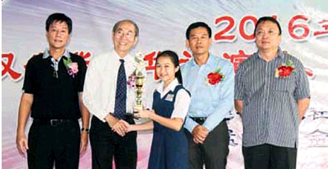 晉漢連省華總會長天猛公劉金榮(左2)在晉漢省華小教師會主席王芍強、晉漢省津貼華小董聯會會長劉天亮及晉漢省津貼華小董聯會署理會長蔡文鐸的陪同下,頒獎予其中一位得獎者。
