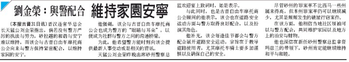 (本報古晉31日訊)晉漢連省華總會長天猛公劉金榮指出,倘若沒有警方嚴厲的執法与努力,砂拉越的和諧与安宁難以維持,而該會与古晉自由車摩托商公會向來与警方保持緊密配合,以維持家園的安宁。
