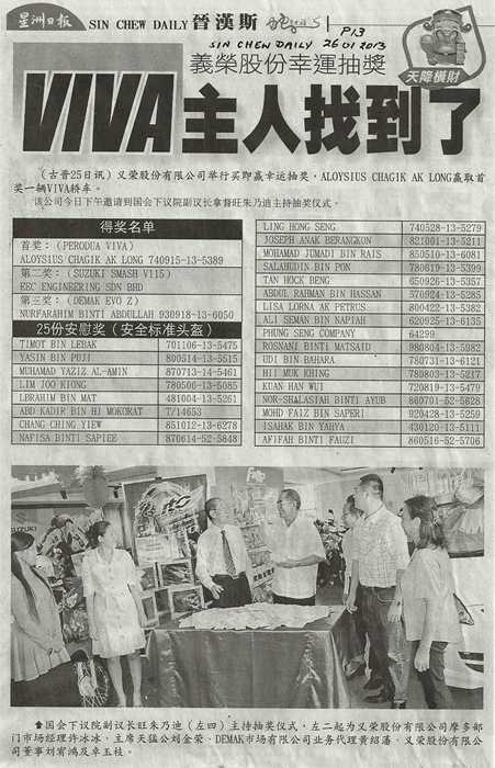 (SIN CHEW DAILY新闻稿) 义荣股份有限公司举行买即赢幸运抽奖,ALOYSIUS CHAGIK AK LONG 赢取首奖一辆VIVA轿车。